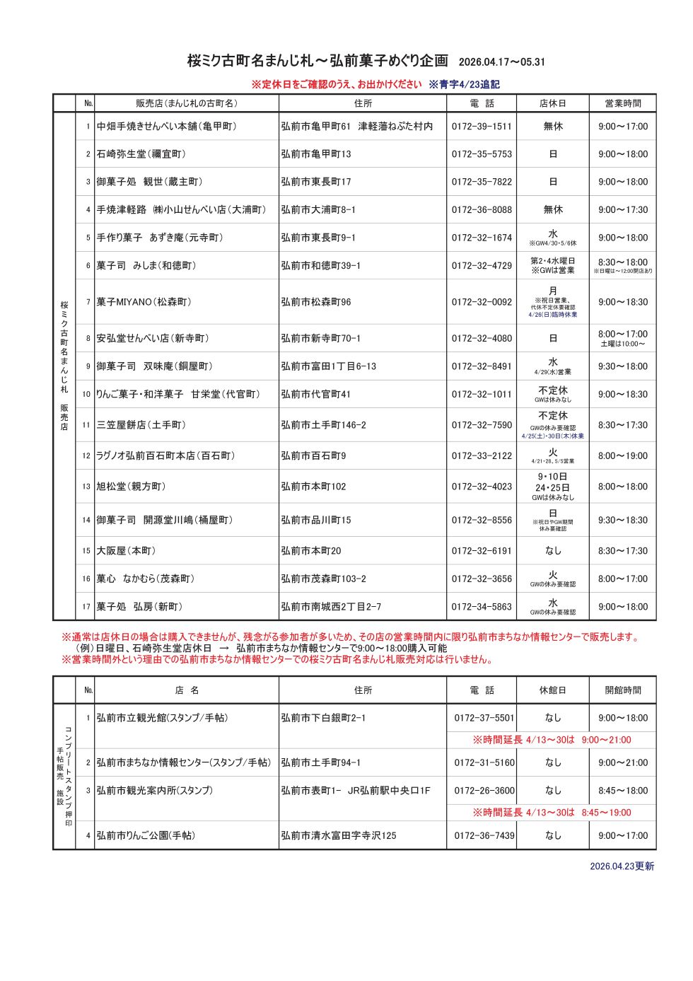 弘前さくらまつり公式応援キャラクター「桜ミク」とコラボし、城下町弘前ならではの「古町名(こちょうめい)」と「桜ミク」イラストのデザインのまんじ札を収集しながら、弘前のお菓子めぐりを楽しむ企画です。
