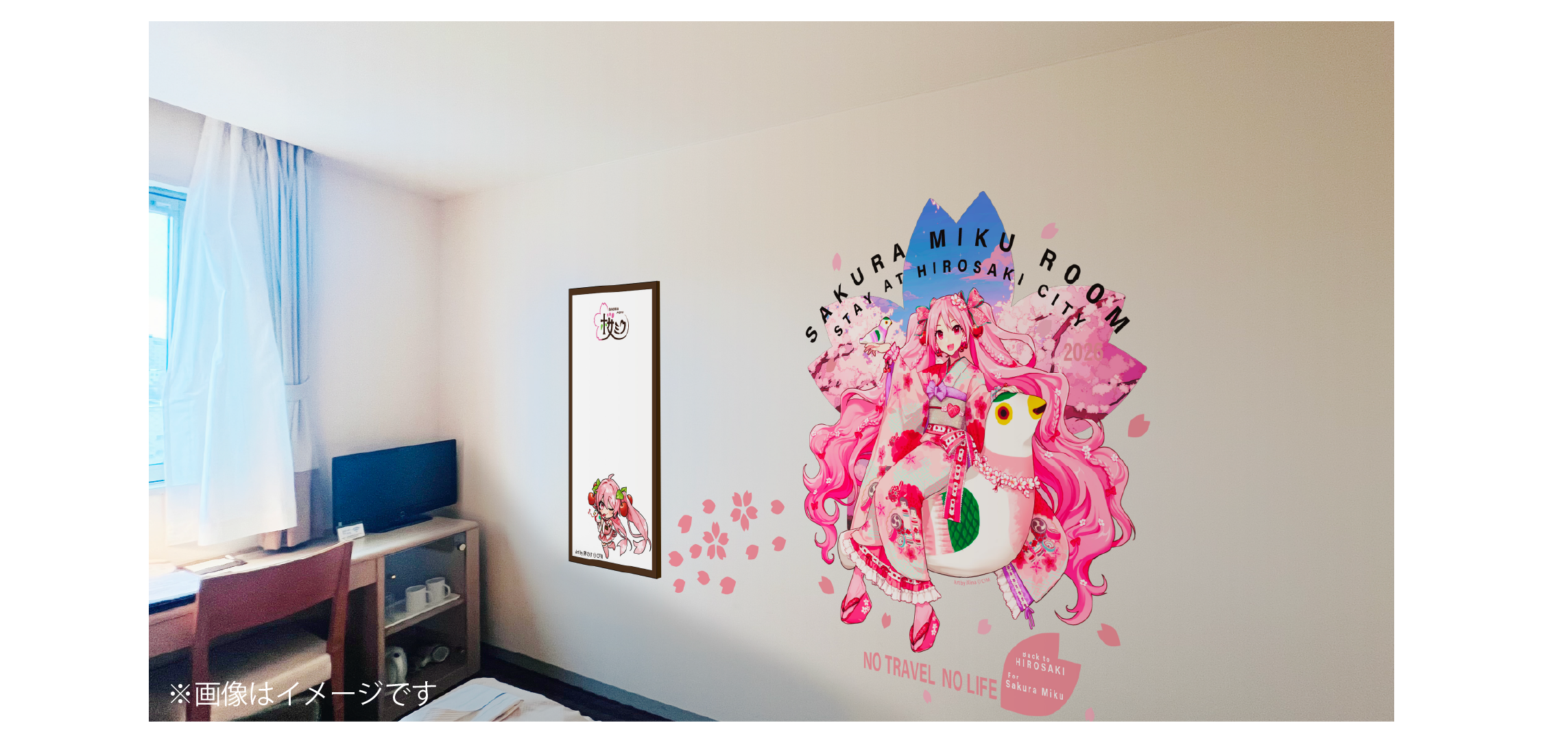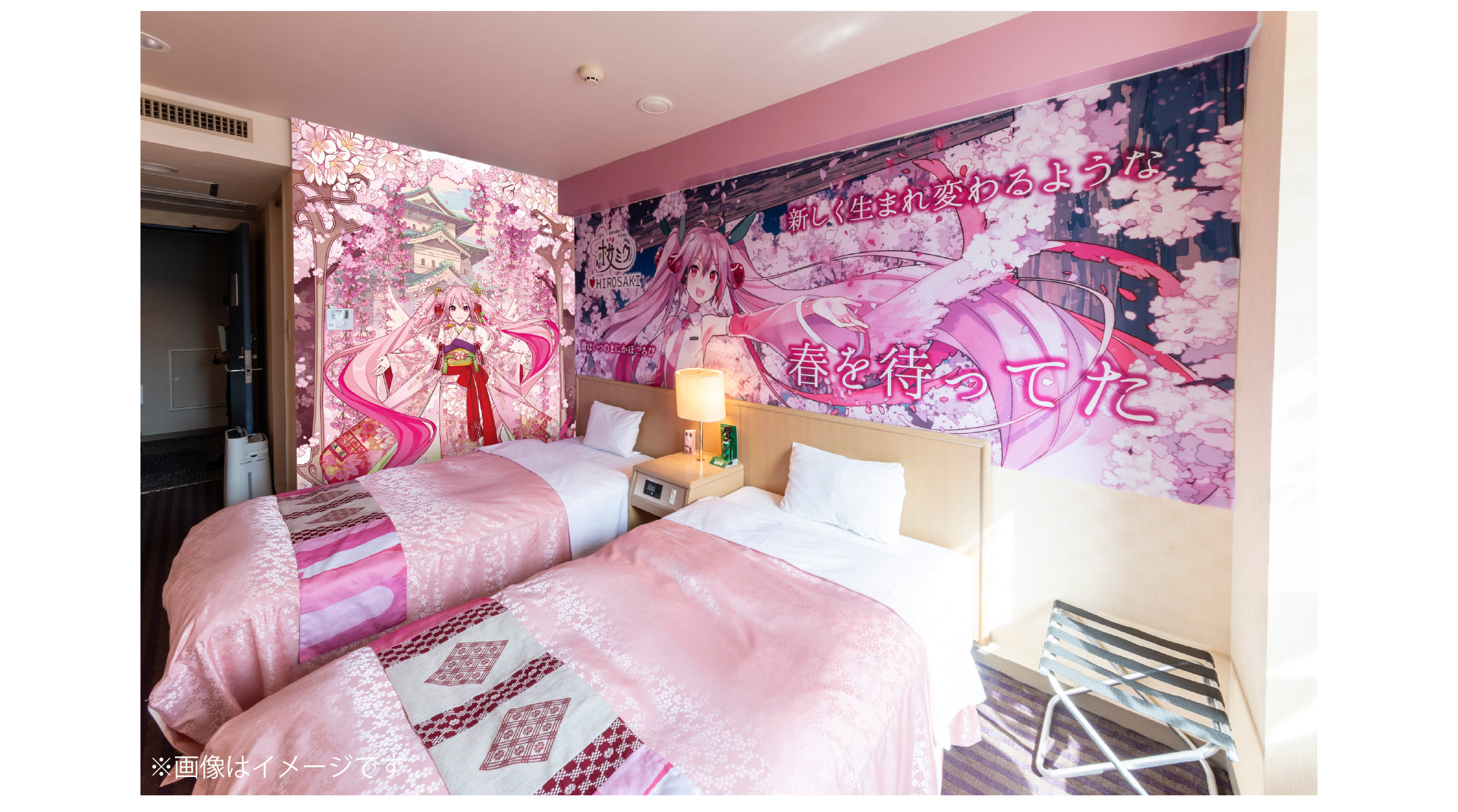 お部屋全体が「桜ミク」のキャラクターイメージ装飾になっています。昨年のお部屋デザインをベースに、今年は更にグレードアップしました。桜の弘前城を背景にした大型タペストリーに加え、2024年版メインビジュアルの大型タペストリーが登場しました。