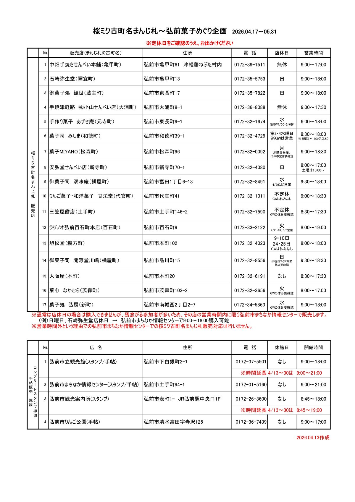 弘前さくらまつり公式応援キャラクター「桜ミク」とコラボし、城下町弘前ならではの「古町名(こちょうめい)」と「桜ミク」イラストのデザインのまんじ札を収集しながら、弘前のお菓子めぐりを楽しむ企画です。